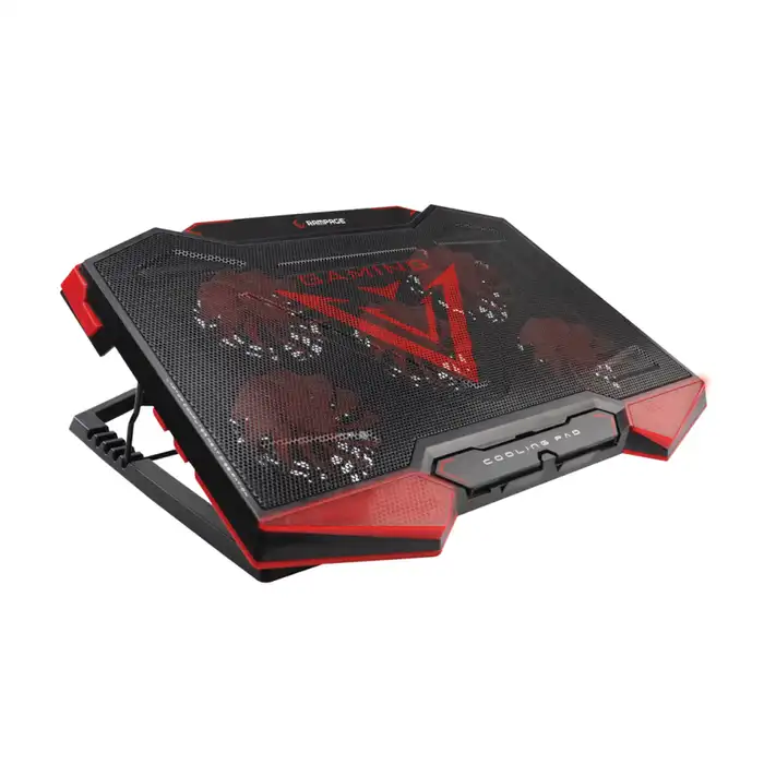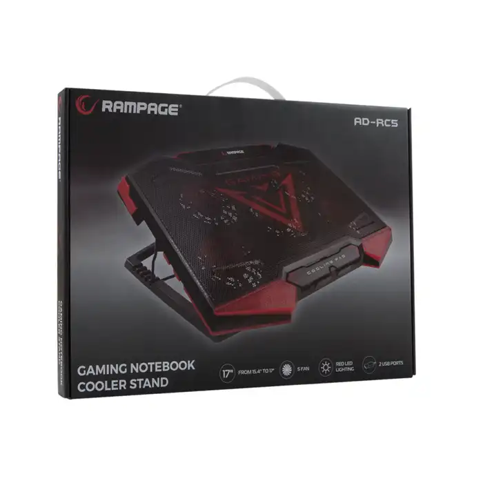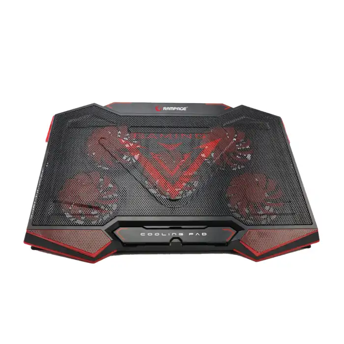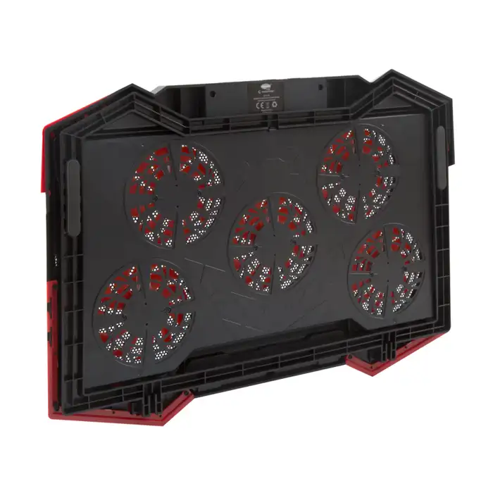 Gamer hladnjak za prijenosna računala veličine 15,4” – 17” s crvenim LED osvjetljenjem i 2 dodatna USB priključka. Za hlađenje je zaduženo 5 ventilatora od 10 cm.