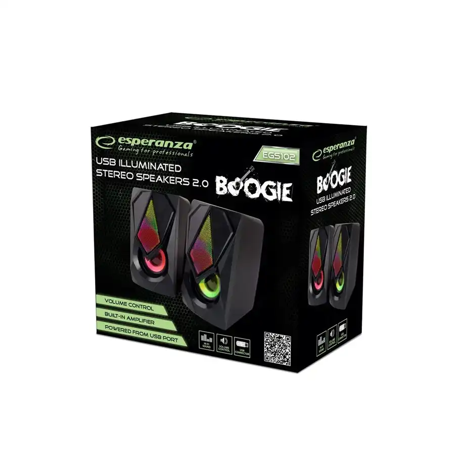 Visokokvalitetni stereo zvučnici za laptopove i desktop računare. Esperanza zvučnici su napravljeni od visokokvalitetnih komponenti koje garantuju čist i prirodan zvuk. Kućište zvučnika je kombinacija plastike i metala, što zajedno čini uređaj modernog dizajna. Materijali zvučnika visokog kvaliteta štite ih od statičkog elektriciteta i elektromagnetnih smetnji. Boogie je set koji će se dopasti svim igračima. Svaki zvučnik je opremljen sa dve svetlosne zone na prednjem delu kućišta. Kada su povezani sa izvorom, zvučnici se ciklično osvetljavaju različitim bojama i njihovim kombinacijama, stvarajući efekat duge. Boogie je set koji korisnicima pruža nezaboravno zvučno i vizuelno iskustvo. Zvučnici se napajaju putem USB konektora integrisanog u kablu. Nema potrebe za posebnim napajanjem! To znači da zvučnici ne zahtevaju pristup električnoj utičnici, što ih čini odličnim za putovanja. USB je svetski priznati standard koji se koristi za prenos energije ili podataka u mnogim prenosivim elektronskim uređajima. U trenutku ih možete povezati sa laptopom ili računarom i odmah uživati u sjajnom kvalitetu zvuka! Boogie set komunicira sa povezanim uređajem putem standardnog 3,5mm mini jack konektora. Ovaj konektor se nalazi na svakom računaru, MP3 plejerima i većini mobilnih telefona. Ovo znači da su Esperanza zvučnici izuzetno svestrani. Ugrađena audio kontrola omogućava brzo i jednostavno podešavanje jačine zvuka pomoću dugmeta na kablu.