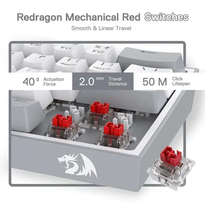Najtiši mehanički prekidači, crveni switch-evi, mogu se mijenjati u radu drugim ReDragon prekidačima. Testovi su potvrdili da tastatura ima izdržljivost od oko 50 miliona pritisaka po tasteru. Na ovoj fantastičnoj tastaturi moguće je unaprijed postaviti do 20 načina pozadinskog osvjetljenja. Svjetlina i brzina protoka takođe se mogu podešavati.
