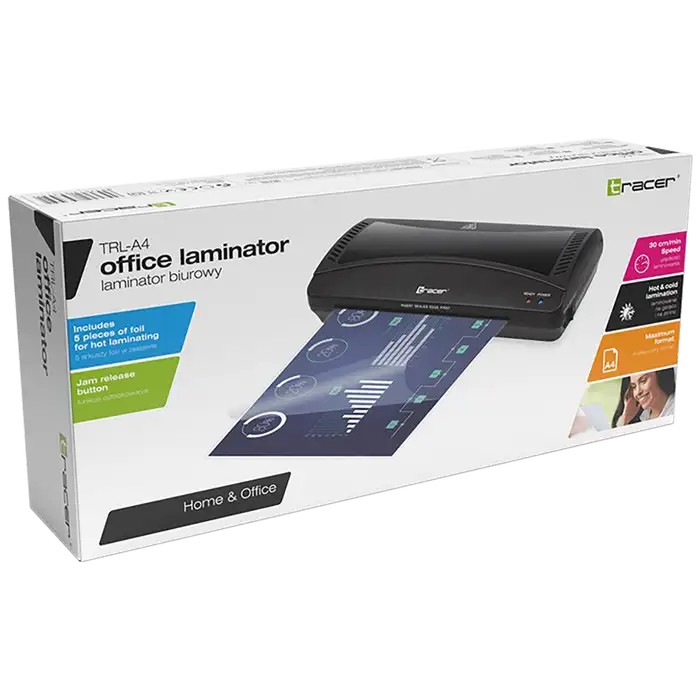Laminacija vam omogućava da produžite vijek trajanja dokumenata, štiteći ih od vanjskih utjecaja. Proces plastificiranja se sastoji u pokrivanju cijele površine otiska prozirnom plastičnom folijom. Tracer laminator je savršen za kućnu ili uredsku upotrebu. Sa TRACER TRL-A4 laminatorom možete biti sigurni da su vaši kućni i poslovni dokumenti, fotografije, razglednice i drugi vrijedni predmeti propisno zaštićeni od oštećenja.
