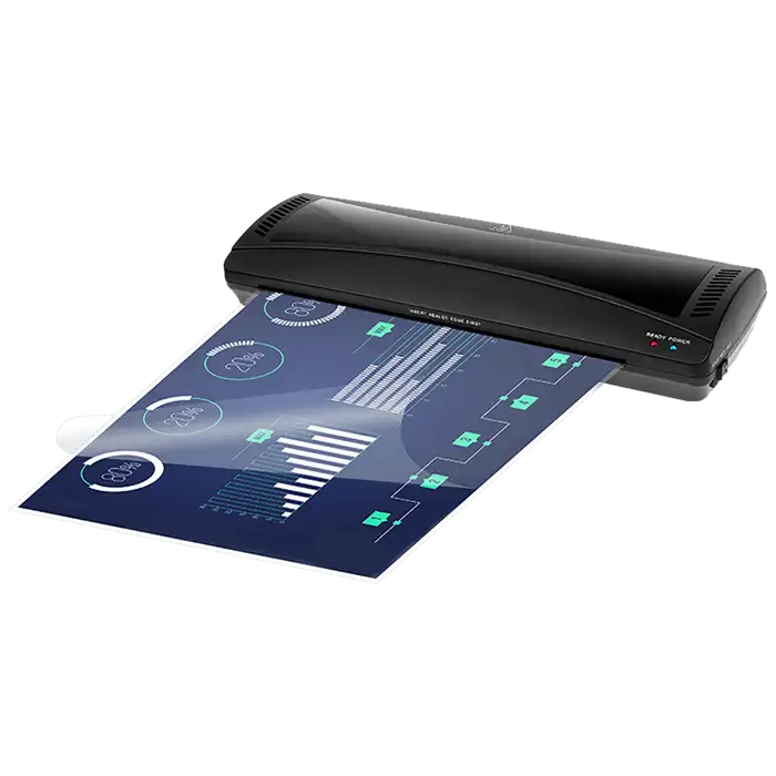 • Prvi način se sastoji u zagrijavanju folije tako da se trajno zalijepi za tabak, dok drugi način čvrsto pritišće valjke laminatora uz foliju i list, omogućavajući mu da dobro pokrije dokument. Maksimalna širina folije 220 mm, maksimalna debljina folije 125 mikrona, brzina plastifikacije 30 cm/min.