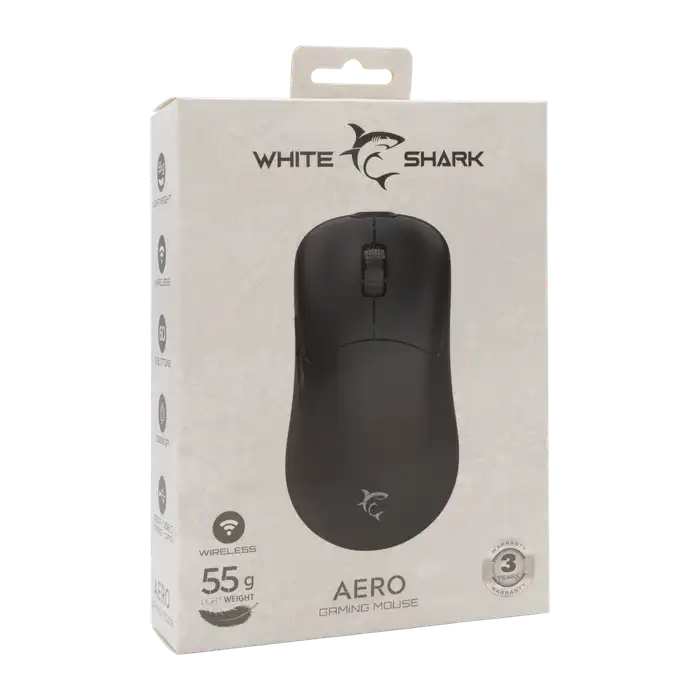 White Shark AERO Black – Wireless je lagani i responzivni bežični gaming miš dizajniran za igrače koji žele slobodu kretanja uz pouzdane performanse. Opremljen Pixart 3325 optičkim senzorom, omogućuje precizno praćenje pokreta s osnovnom rezolucijom do 5.000 DPI, koja se putem softvera može povećati do 10.000 DPI.