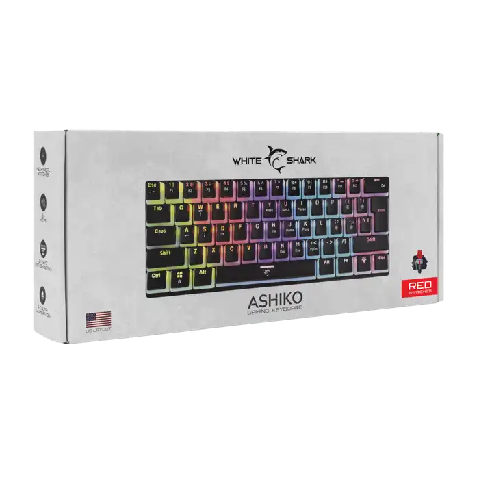 White Shark GK-2202 Ashiko Gaming mehanička tastatura crna crveni prekidači, RGB, mehanička, USB – Mala, kompaktna, prenosiva tastatura sa sjajnim RGB osvetljenjem!