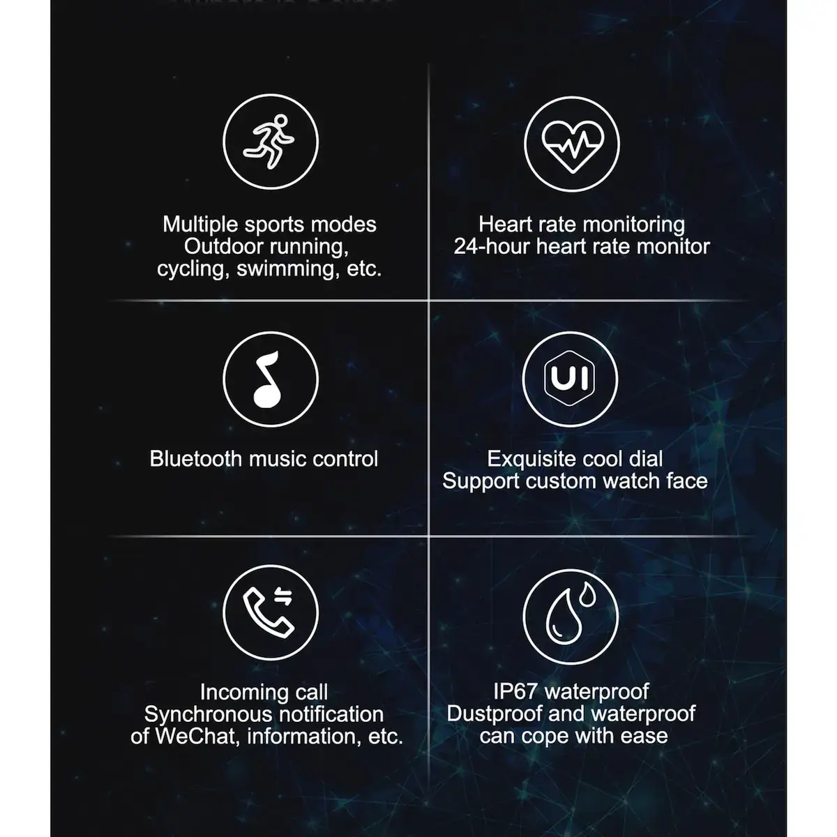 - Funkcije: poruke, kontrola tjelesne temperature, detekcija frekvencije srca, mjerenje krvnog tlaka, pedometar, podsjetnik na sjedenje, praćenje sna, Bluetooth glazbeni player