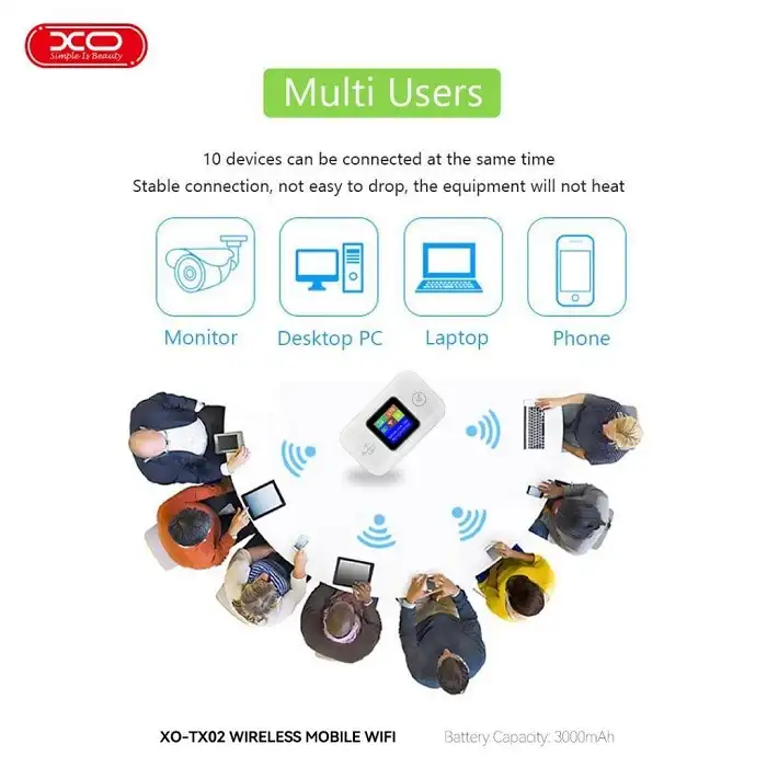 XO TX02 4G LTE Mobilni Wi-Fi ruter podržava do 8 uređaja istovremeno, idealno za smartphone, laptop ili tablet, sa ugrađenom memorijom Flash 32GB i 4GB RAM-a za glatko funkcionisanje.